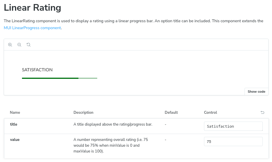This project has a simple “Linear Rating” component that puts a title above a rating value. Here it is in Storybook.